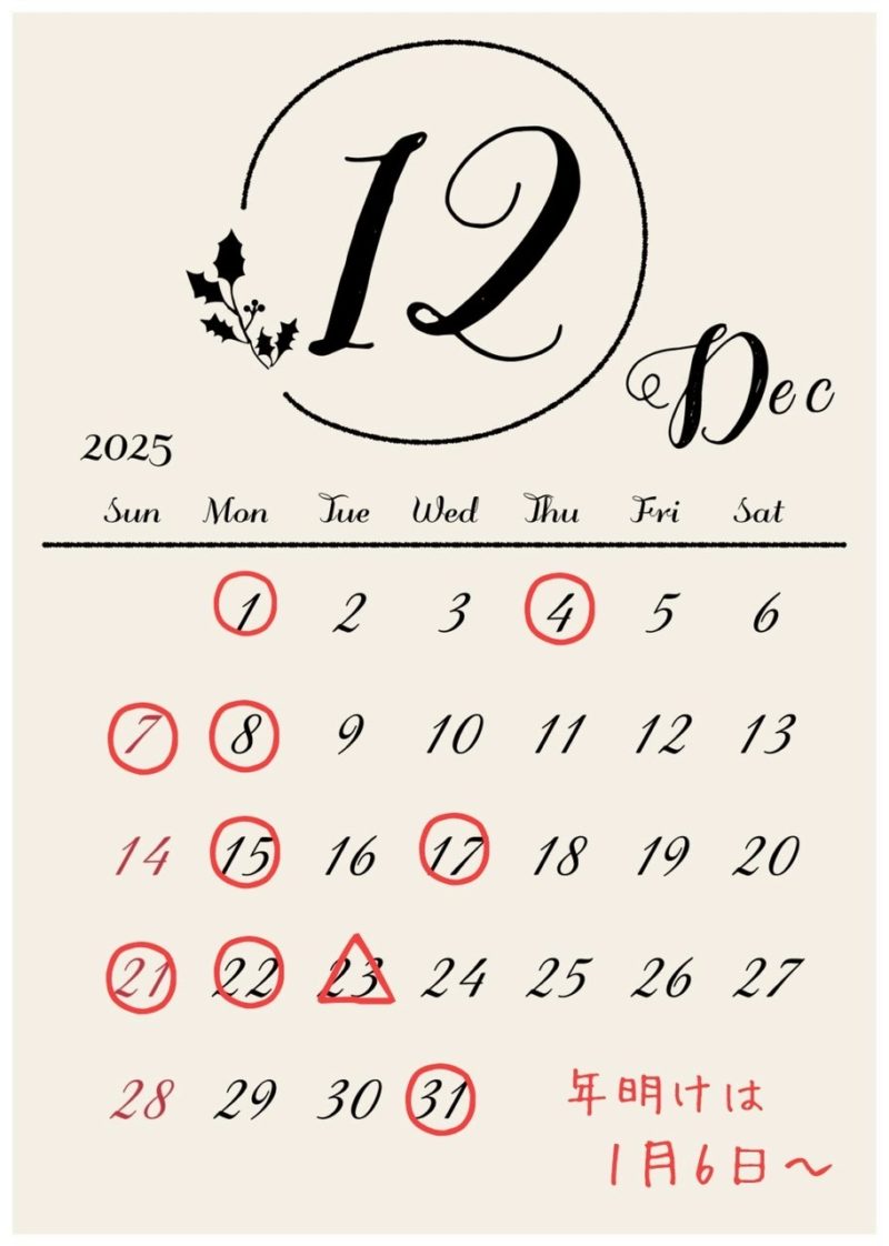 🎅12月の店休日のお知らせです🎄