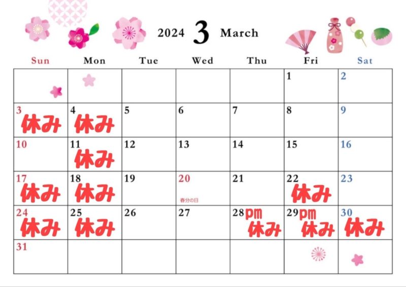 3月最後の週のお休みが多くなっております🙏ご迷惑をお掛けしてしまい申し訳ございません💦