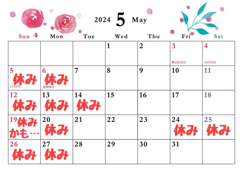⏬下記カレンダーの日程をお休みさせていただきます🙇